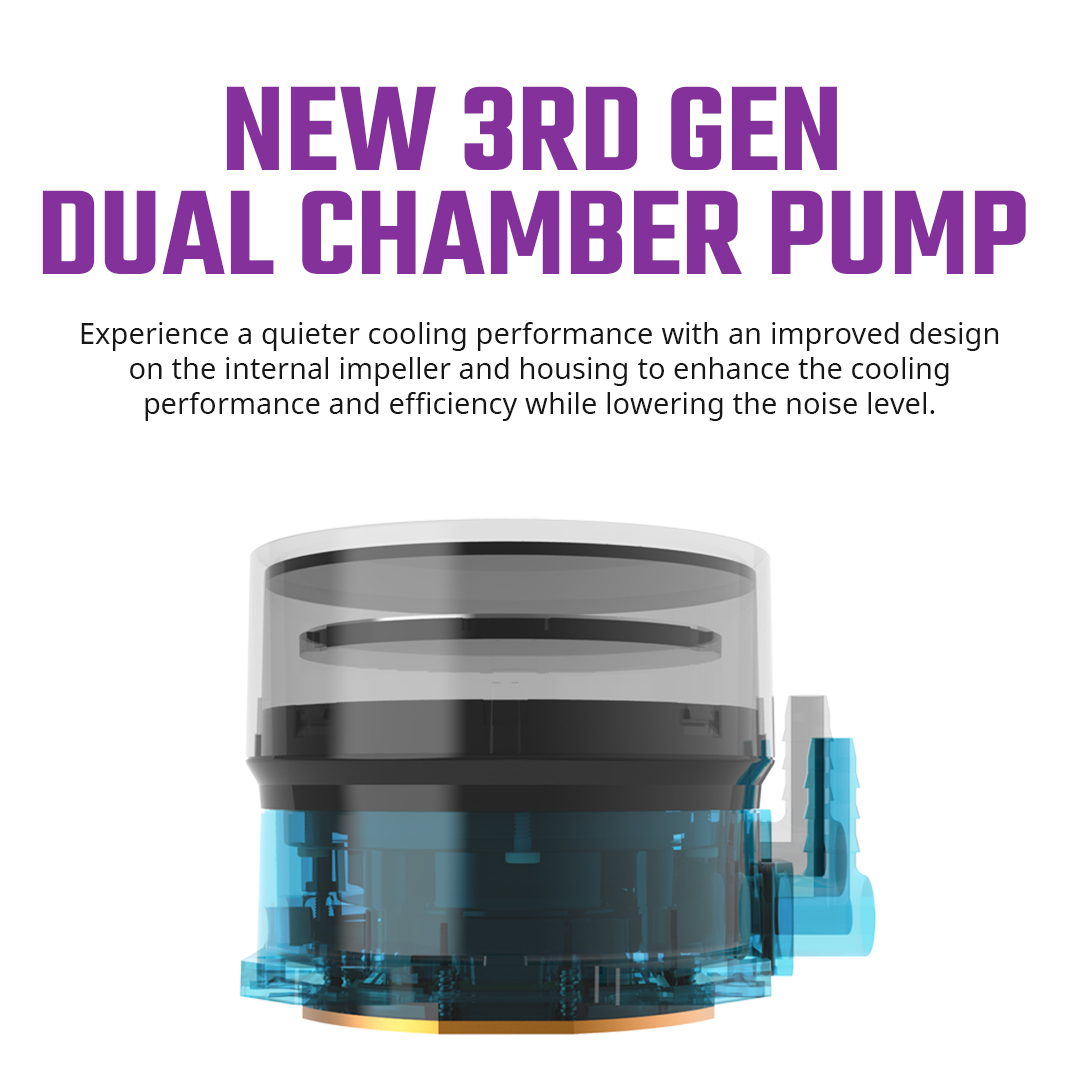 3rd Gen Dual Chamber Pump: Next level cooling with our redesigned housing and impeller to eliminate heat better than ever while keeping the sound at a chilling silence.